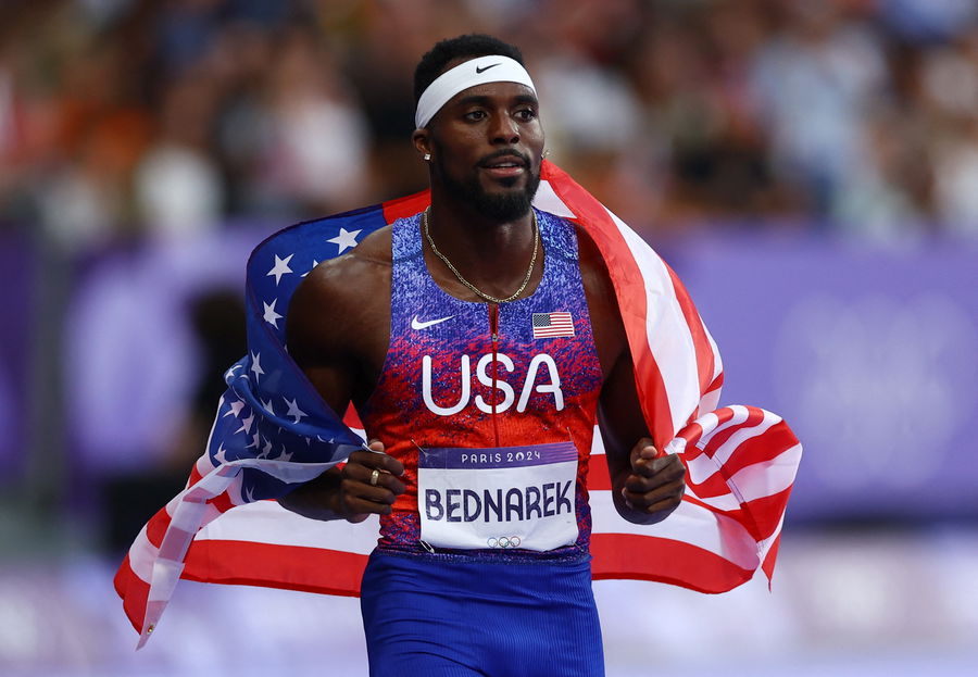 Paris 2024 Olympics – Athletics – Men’s 200m Final – Stade de France, Saint-Denis, France – August 08, 2024. Silver medallist Kenneth Bednarek of United States reacts after the race. REUTERS/Aleksandra Szmigiel