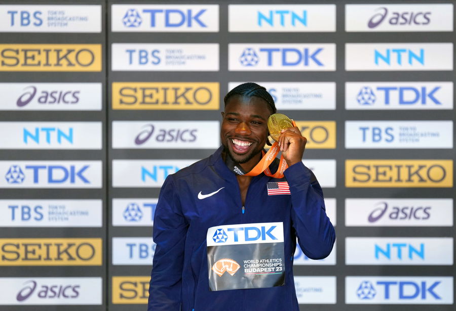 USA’s Noah Lyles on the podium with his gold medal in the Men’s 100m during day three of the World Athletics Championships in Budapest, Hungary. Picture date: Monday August 21, 2023. (Photo by Martin Rickett/PA Images via Getty Images)