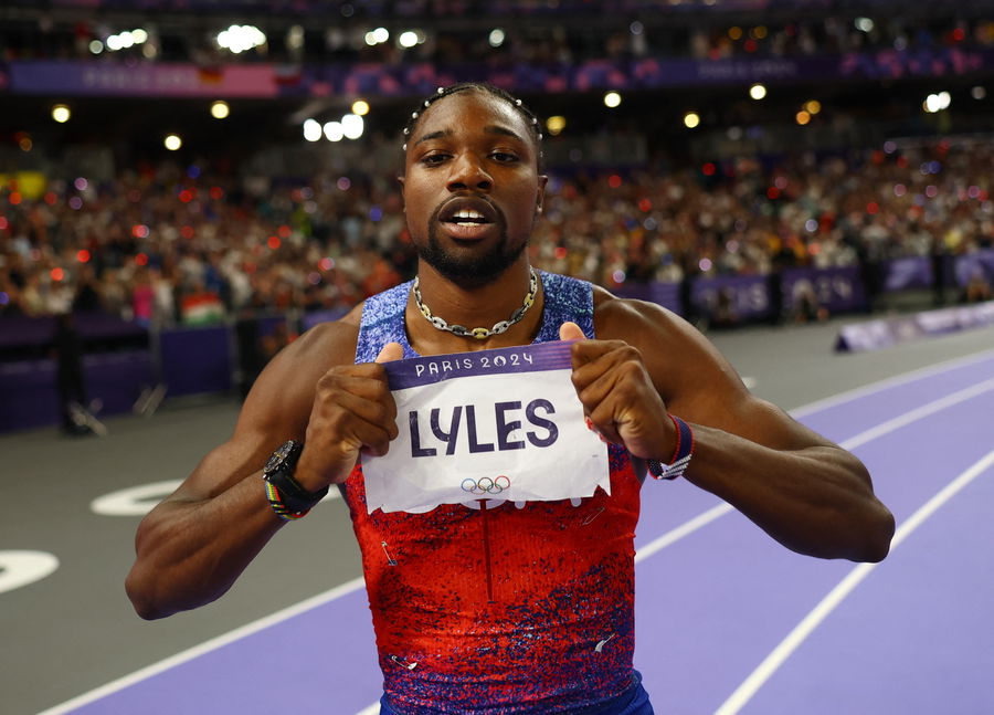 Paris 2024 Olympics – Athletics – Men’s 100m Final – Stade de France, Saint-Denis, France – August 04, 2024. Noah Lyles of United States celebrates after winning gold. REUTERS/Kai Pfaffenbach