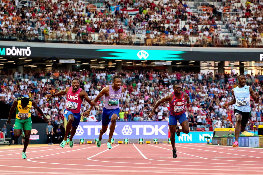 BUDAPEST, HUNGARY – AUGUST 20: Oblique Seville of Team Jamaica, Noah Lyles of Team United States, and Zharnel Hughes of Team Great Britain cross the finish line in the Men’s 100m Final