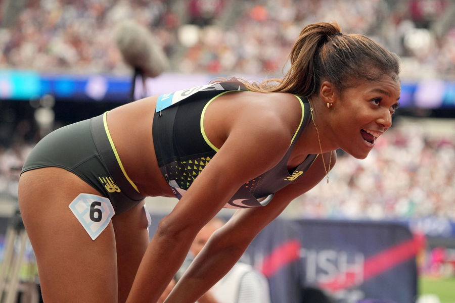 Jul 20, 2024; London, United Kingdom; Gabrielle Thomas aka Gabby Thomas (USA) reacts after winning the women’s 200m in a meet record 21.82 during the London Athletics Meet at London Stadium. Mandatory Credit: Kirby Lee-USA TODAY Sports