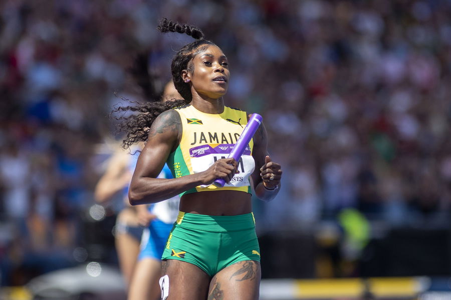 BIRMINGHAM, ENGLAND – AUGUST 7: Elaine Thompson-Herah of Jamaica after running the final leg of her teams bronze medal win in the Women’s 4 x 100m Relay – Final during the Athletics competition at Alexander Stadium during the Birmingham 2022 Commonwealth Games on August 7, 2022, in Birmingham, England. (Photo by Tim Clayton/Corbis via Getty Images)
