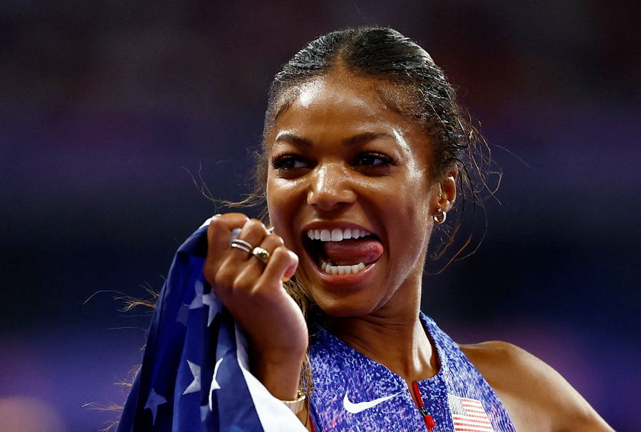 Paris 2024 Olympics – Athletics – Women’s 200m Final – Stade de France, Saint-Denis, France – August 06, 2024. Gabrielle Thomas of United States celebrates after winning gold. REUTERS/Sarah Meyssonnier TPX IMAGES OF THE DAY