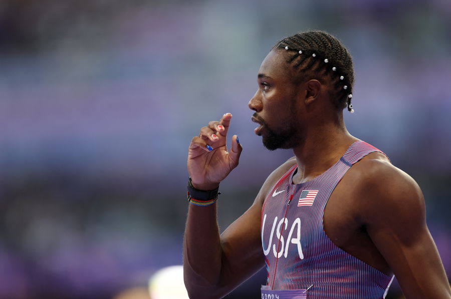 Paris 2024 Olympics – Athletics – Men’s 200m Round 1 – Stade de France, Saint-Denis, France – August 05, 2024. Noah Lyles of United States before the start of heat 6. REUTERS/Lisa Leutner
