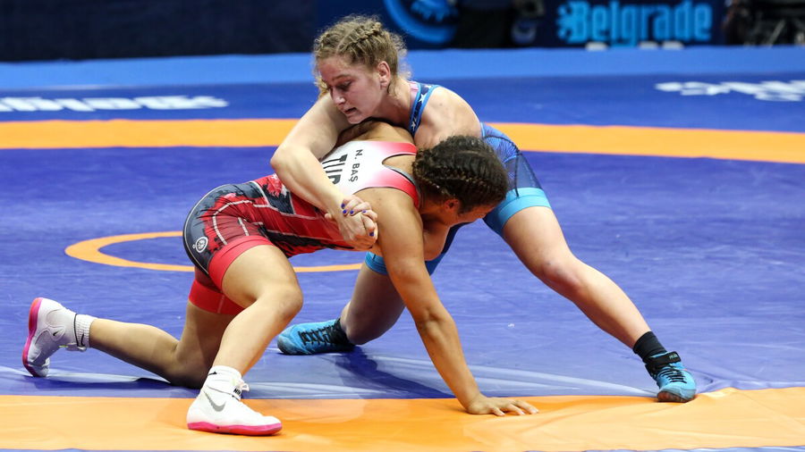 BELGRADE, SERBIA – SEPTEMBER 20: Nesrin Bas (red) of Turkiye competes with Amit Elor (blue) of USA during Women’s Wrestling 72kg at the World Wrestling Championships in Belgrade, Serbia on September 20, 2023. (Photo by Filip Stevanovic/Anadolu Agency via Getty Images)