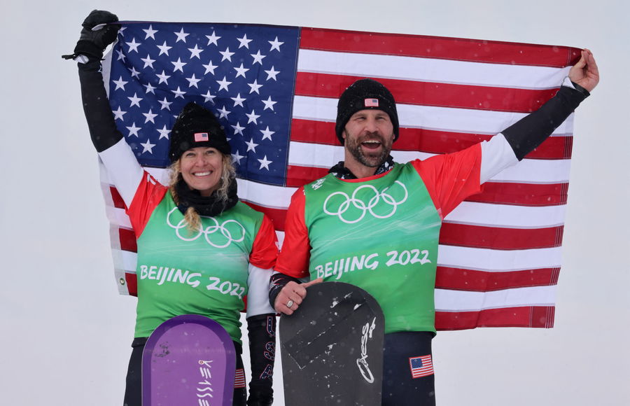 2022 Beijing Olympics – Snowboard – Mixed Team Snowboard Cross Big Final – Genting Snow Park, Zhangjiakou, China – February 12, 2022. Gold medallists Nick Baumgartner and Lindsey Jacobellis of the United States celebrate during the flower ceremony. REUTERS/Mike Blake