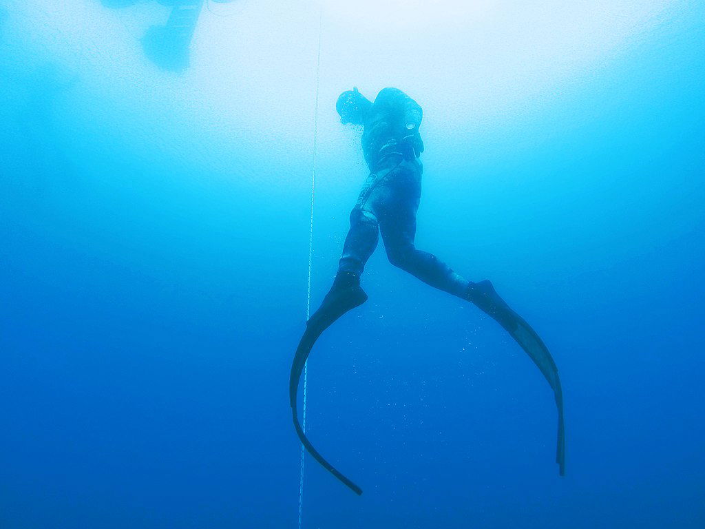 After a deep breath, Zecchini dives under the water and makes her descent. While she wears no gear, her safety diver and training partner Stephen Keenan trails the champion as she descends into the depths of the blue hole. Filmmaker Laura McGann captures the dive on camera and simulates the tense silence with a slowing heartbeat as Zecchini descends. Zecchini calls the depths “The last quiet place on Earth.”