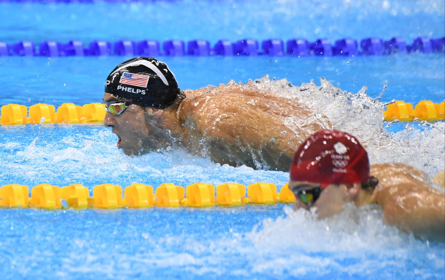 RIO DE JANEIRO, BRAZIL – AUGUST 13: Micheal Phelps pulls ahead during the butterfly portion of the 4x100m medley relay gold medal win during the Olympic Games on August 13, 2016, in Rio De Janeiro, (Photo by Jonathan Newton / The Washington Post via Getty Images)