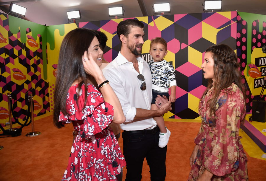 SANTA MONICA, CA – JULY 19: (L-R) Nicole Johnson, swimmer Michael Phelps, Boomer Robert Phelps, and honoree Danica Patrick attend the Nickelodeon Kids’ Choice Sports 2018 at Barker Hangar on July 19, 2018, in Santa Monica, California. (Photo by Kevin Mazur/Getty Images)