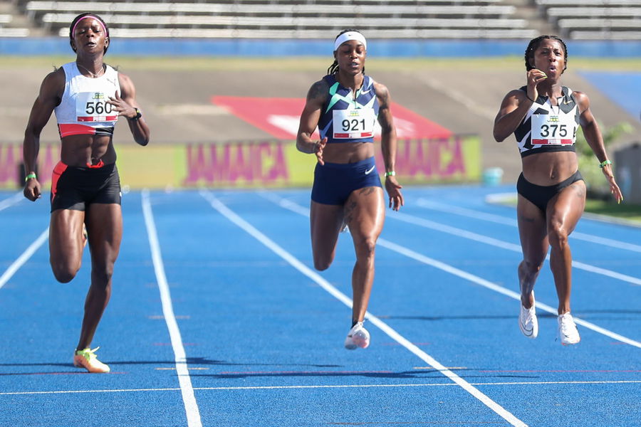 Athletics – JAAA National Senior Championships – National Stadium, Kingston, Jamaica – June 27, 2021 Jamaica’s Sherika Jackson, Elaine Thompson-Hera and Shelly-Ann Fraser-Pryce in action during the women’s 200 m REUTERS/Gilbert Bellamy