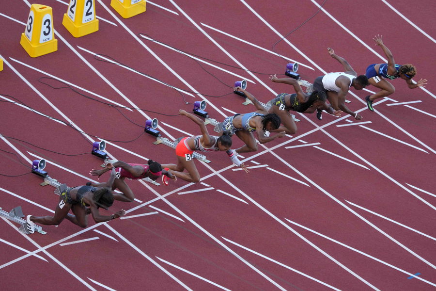 Jun 18, 2021; Eugene, OR, USA; A general overall view of sprinters in the starting blocks of a women’s 100m heat, Dezerea Bryant (1), Jada Baylark (2), Ashley Henderson (3), Aleia Hobbs (4), Gabby Thomas (5), Tamara Clark (6) and Morolake Akinosun (7), during the US Olympic Team Trials at Hayward Field. Mandatory Credit: Kirby Lee-USA TODAY Sports