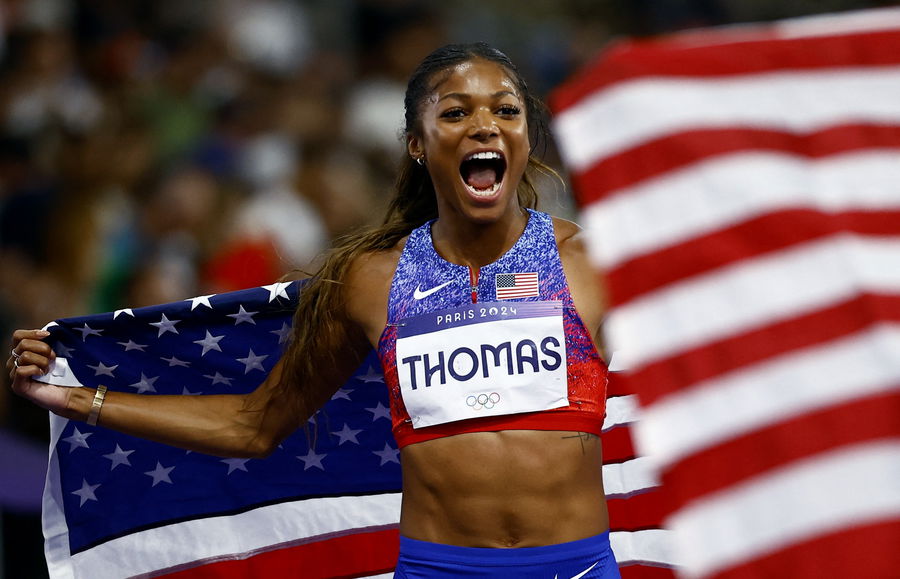 Paris 2024 Olympics – Athletics – Women’s 200m Final – Stade de France, Saint-Denis, France – August 06, 2024. Gabrielle Thomas of United States celebrates after winning gold. REUTERS/Sarah Meyssonnier