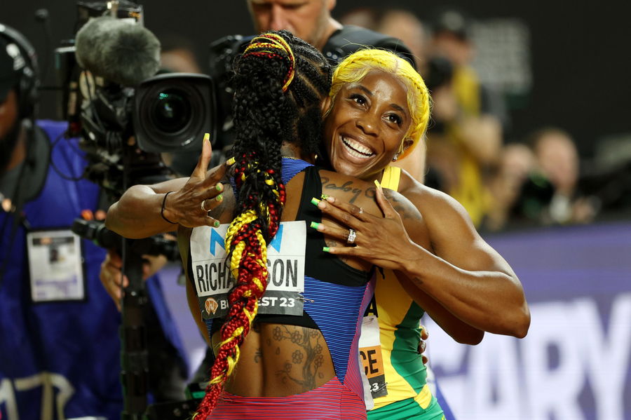 BUDAPEST, HUNGARY – AUGUST 21: Sha’Carri Richardson of Team United States celebrates winning the Women’s 100m Final with bronze medalist Shelly-Ann Fraser-Pryce of Team Jamaica during day three of the World Athletics Championships Budapest 2023 at National Athletics Centre on August 21, 2023, in Budapest, Hungary. (Photo by Patrick Smith/Getty Images)