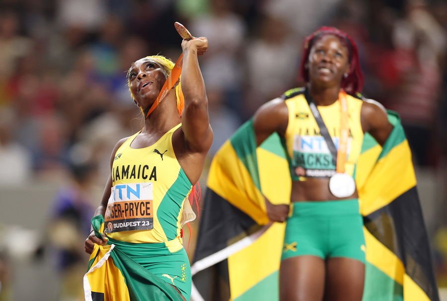 BUDAPEST, HUNGARY – AUGUST 21: Bronze medalist Shelly-Ann Fraser-Pryce of Team Jamaica and silver medalist Shericka Jackson of Team Jamaica celebrate after the Women’s 100m Final during day three of the World Athletics Championships Budapest 2023 at National Athletics Centre on August 21, 2023 in Budapest, Hungary. (Photo by Christian Petersen/Getty Images for World Athletics)