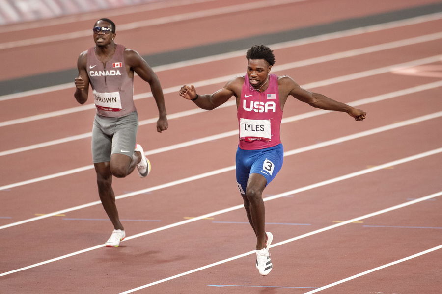 TOKYO, JAPAN August 4: Noah Lyles of the United States finishing in third place to win the bronze medal with Aaron Brown of Canada finishing in sixth place in the 200m Final for men at the Olympic Stadium during the Tokyo 2020 Summer Olympic Games on August 4th, 2021 in Tokyo, Japan. (Photo by Tim Clayton/Corbis via Getty Images)