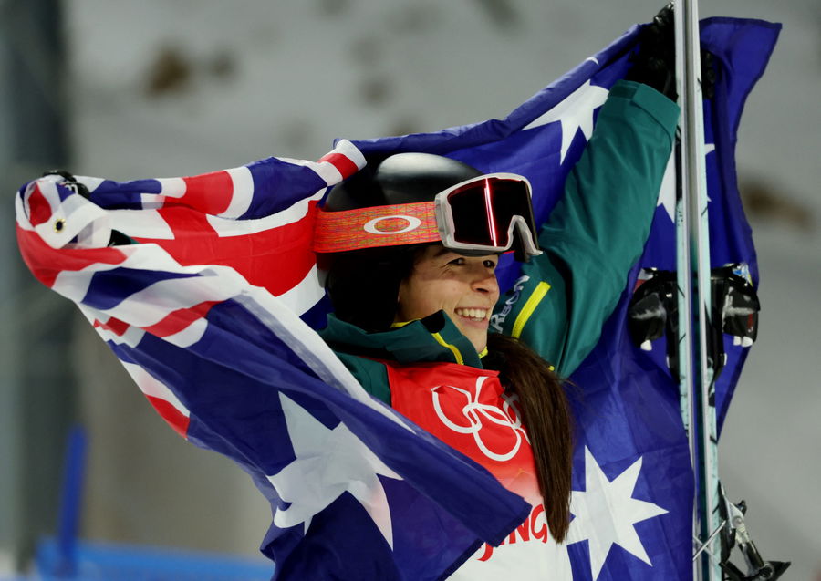 2022 Beijing Olympics – Freestyle Skiing – Women’s Moguls – Final 3 – Genting Snow Park, Zhangjiakou, China – February 6, 2022. Gold medalist Jakara Anthony of Australia celebrates during the flower ceremony. REUTERS/Mike Blake