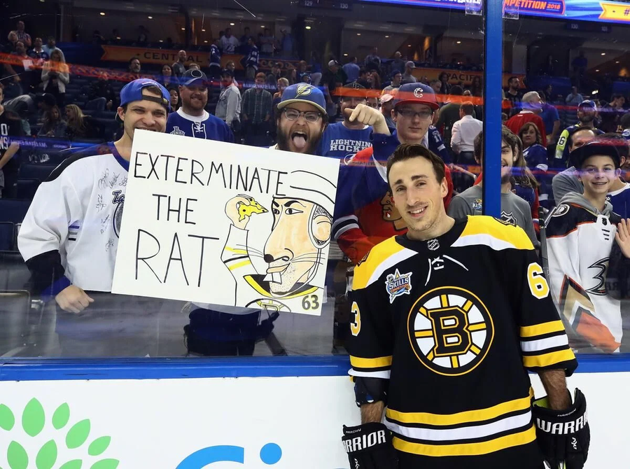 Since arriving in Florida, Brad Marchand has also found himself at the center of one of hockey’s most bizarre yet beloved traditions. Every time the Panthers win, his teammates gleefully launch plastic rats at him using their sticks. An homage both to the franchise’s “Rat Trick” legacy—originating in the 1995-96 season when Scott Mellanby killed a rat with his stick on the way to a legendary Cup run—and to Marchand’s notorious “rat” reputation for being a heel his whole career. I mean, who can forget that iconic photo of Marchand grinning while posing next to a pair of Lightning fans holding up a homemade sign with a caricature of Marchand alongside the words “EXTERMINATE THE RAT“?