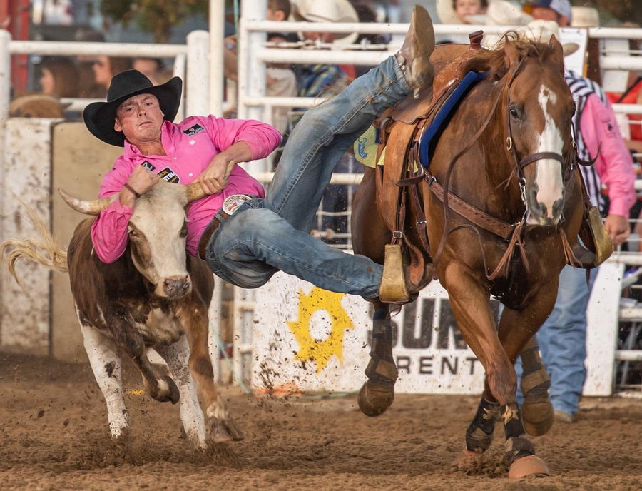 The cowboy races after the calf and comes up to it in a matter of seconds, at which point he leaps off his horse and snatches the calf by the arms. The cowboy then used his might to halt the calf and twist its neck to bring it to the ground. This spectacular 6.3 seconds of steer wrestling action was scary to witness, but luckily neither the cowboy nor the calf were hurt.