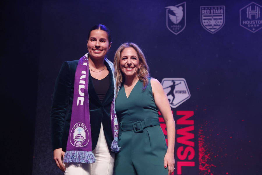 NWSL: 2023 NWSL Draft Jan 12, 2023 Philadelphia, Pennsylvania, USA NWSL commissioner Jessica Berman poses for a photo with Florida State University Emily Madril after being selected by Orlando Pride during the NWSL Draft at Pennsylvania Convention Center. Philadelphia Pennsylvania Convention Center Pennsylvania USA, EDITORIAL USE ONLY PUBLICATIONxINxGERxSUIxAUTxONLY Copyright: xGeoffxBurkex 20230112_ads_sb4_045
