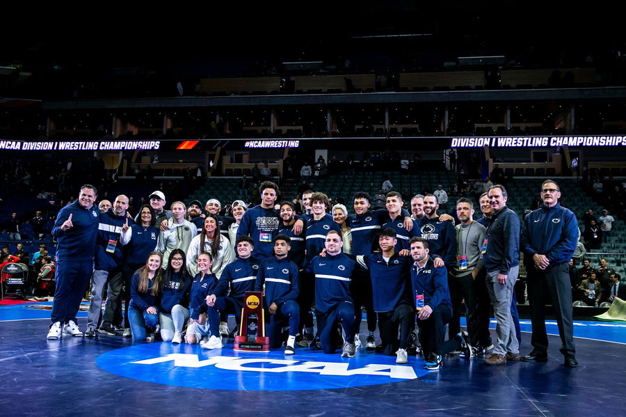 Penn State wrestlers pose for a photo with their national championship trophy in the finals during the sixth session of the NCAA Division I Wrestling Championships, Saturday, March 18, 2023, at BOK Center in Tulsa, Okla.