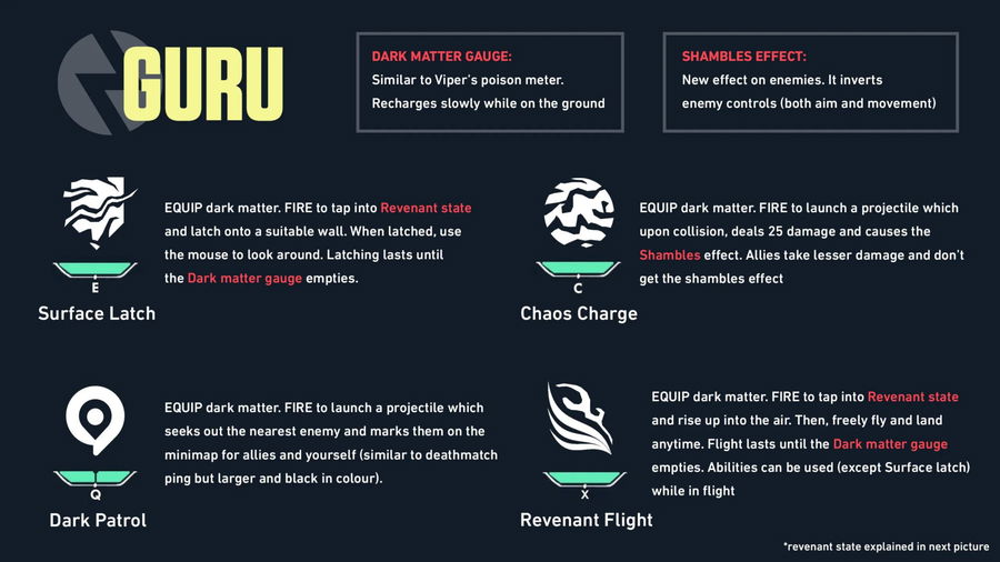 The Dark Patrol launches a projectile that finds the nearest enemy and marks it on the minimap for all the allies. Finally, the Guru’s ultimate is the Revenant Flight, which allows the Agent to fly after entering the Revenant State. Players can also use all the other abilities in flight except for the Surface Latch. All the abilities last until the gauge empties.