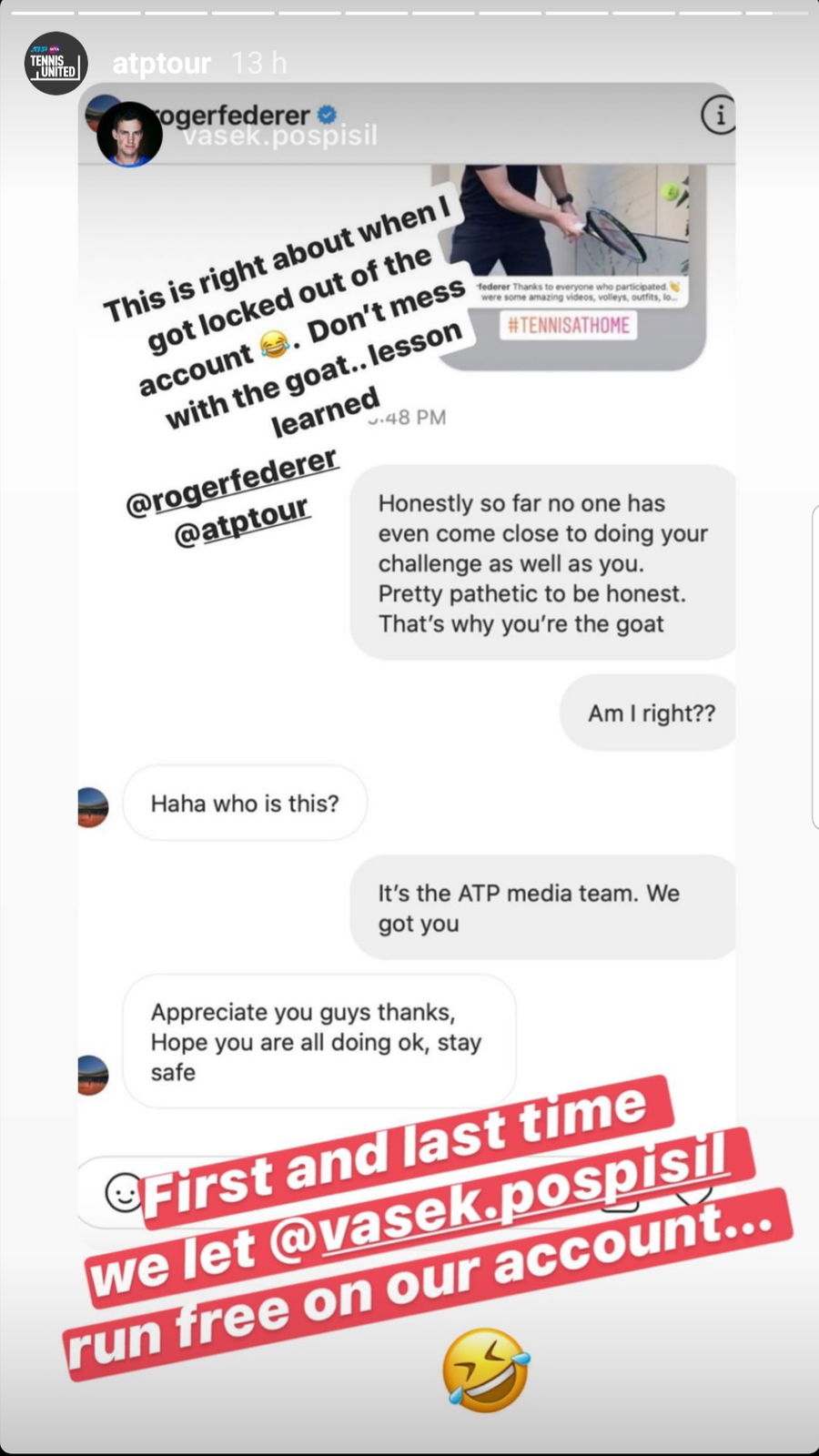 Pospisil also played a joke with Federer about the drill as he got the password of the Instagram account of the ATP. “I want to troll some players from the ATP account”, said Pospisil during an Instagram live with Bethanie Mattek-Sands on the ATP account. “But I couldn’t find anyone, so I just sent some messages”