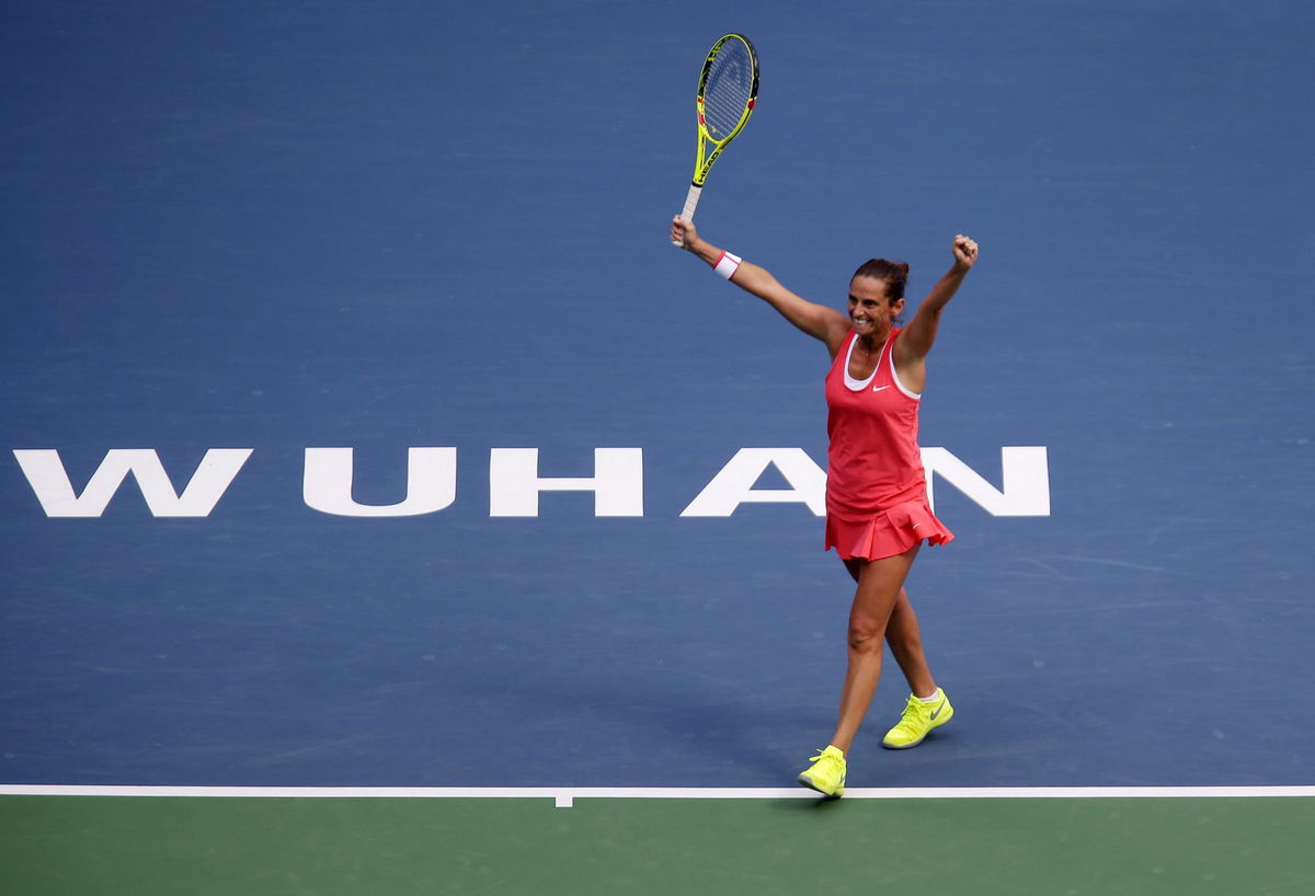 Roberta Vinci of Italy celebrates after winning a point against Karolina Pliskova of the Czech Republic during their women’s singles quarter-final match at the Wuhan Open tennis tournament, Hubei province, October 1, 2015. REUTERS/China Daily