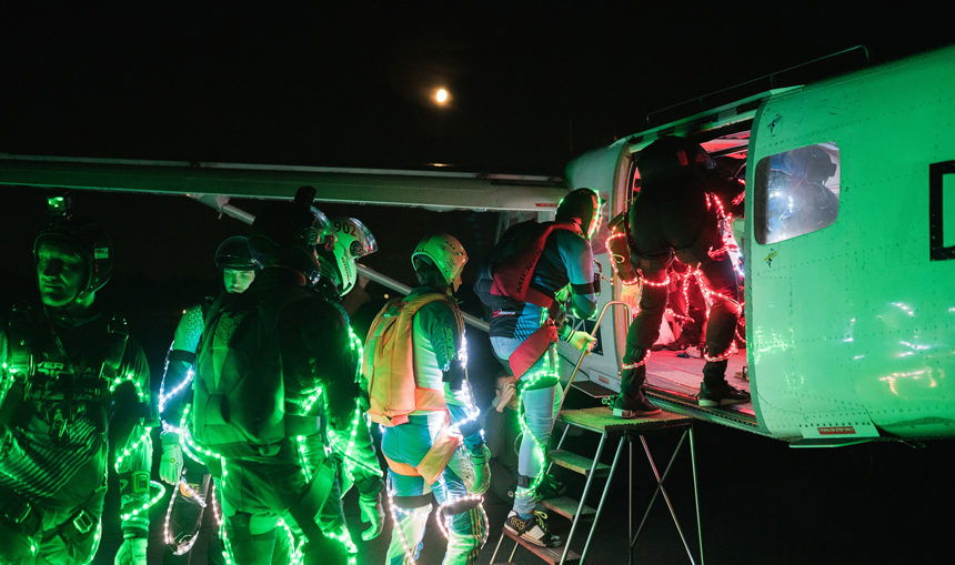 They pursued to create two precise formations during a single jump. However, it was not restricted to this as they progressed to make the whole experience majestic both for themselves and the spectators. Hence, they donned themselves up in special light-up suits equipped with pyrotechnics. With this attempt, they triumphed in escalating their performance, illuminating the night sky.