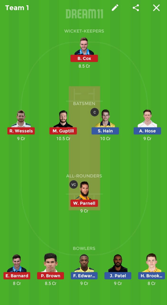 Martin Guptill, Wayne Parnell, Callum Ferguson (C), Ben Cox (WK), Daryl Mitchell, Ross Whiteley, Riki Wessels, Thomas Charles Fell, Ed Barnard, Patrick Brown, Dillon Pennington