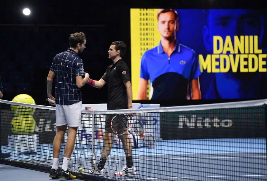 Tennis – ATP Finals – The O2, London, Britain – Russia’s Daniil Medvedev shakes hands with Austria’s Dominic Thiem as he celebrates winning their final match REUTERS/Toby Melville