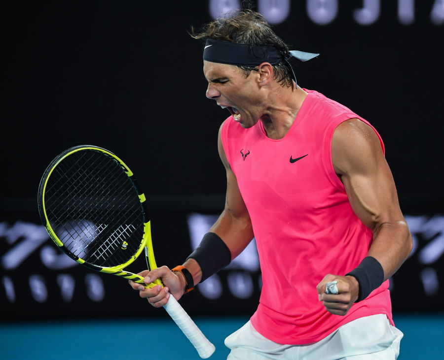 MELBOURNE, AUSTRALIA – JANUARY 27: Rafael Nadal of Spain celebrates winning a set during his fourth round match against Nick Kyrgios of Australia on day eight of the 2020 Australian Open at Melbourne Park on January 27, 2020 in Melbourne, Australia. (Photo by James D. Morgan/Getty Images)