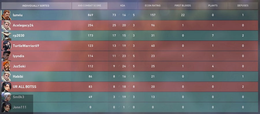 So lunviu was essentially destroying less skilled players, which explains the absurd kill count. This can be seen as a design flaw, rather than a design choice in Valorant, since it may carry the potential to create terribly unbalanced games in unranked matchmaking. Here, highly skilled players may be matched up with beginners, which would make for an uncompetitive experience overall. Moreover, the lobby was bad enough to be dominated by lunviu, but good enough to take the match to 13:12. This is an extremely rare occurrence, and may never happen again.