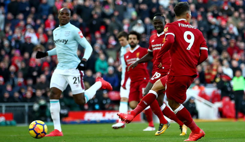 Roberto Firmino with another one of his no-look goals versus West Ham in the Premier League.