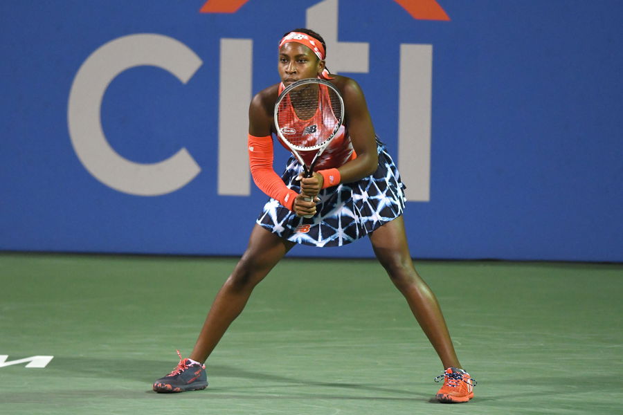 WASHINGTON, DC – AUGUST 05: Cori Gauff of the United States in position during a match against Victoria Azarenka of Belarus on Day 6 during the Womens Invitation of the Citi Open at Rock Creek Tennis Center on August 5, 2021 in Washington, DC. (Photo by Mitchell Layton/Getty Images)