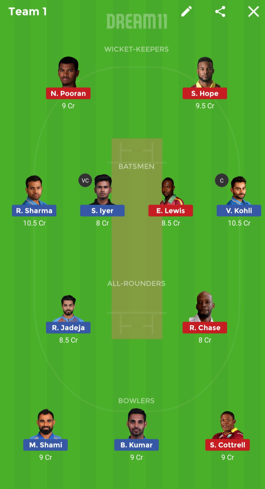 Three bowlers have been named in the WI vs IND Dream 11 predictions team. They are Bhuvneshwar Kumar, Mohammed Shami and Sheldon Cottrell. While Bhuvneshwar Kumar is leading the pace attack by taking 4 wickets in the last game, Shami isn’t far behind. He picked up two.?On the other hand, Sheldon Cottrell is the key bowler of West Indies who have been among wickets.