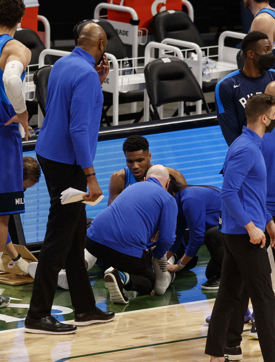 Apr 19, 2021; Milwaukee, Wisconsin, USA; Milwaukee Bucks forward Giannis Antetokounmpo (34) is attended to after being injured during overtime against the Phoenix Suns at Fiserv Forum. Mandatory Credit: Jeff Hanisch-USA TODAY Sports