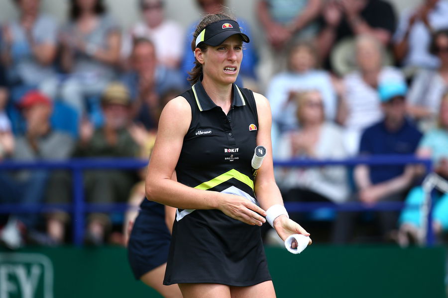 EASTBOURNE, ENGLAND – JUNE 26: Johanna Konta of Great Britain looks on dejected after losing her women’s singles match against Ons Jabeur of Tunisia during day three of the Nature Valley International at Devonshire Park on June 26, 2019 in Eastbourne, United Kingdom. (Photo by Charlie Crowhurst/Getty Images for LTA)