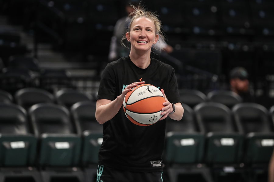 Sep 24, 2023; Brooklyn, New York, USA; New York Liberty guard Courtney Vandersloot (22) warms up prior to game one of the 2023 WNBA Playoffs against the Connecticut Sun at Barclays Center. Mandatory Credit: Wendell Cruz-USA TODAY Sports