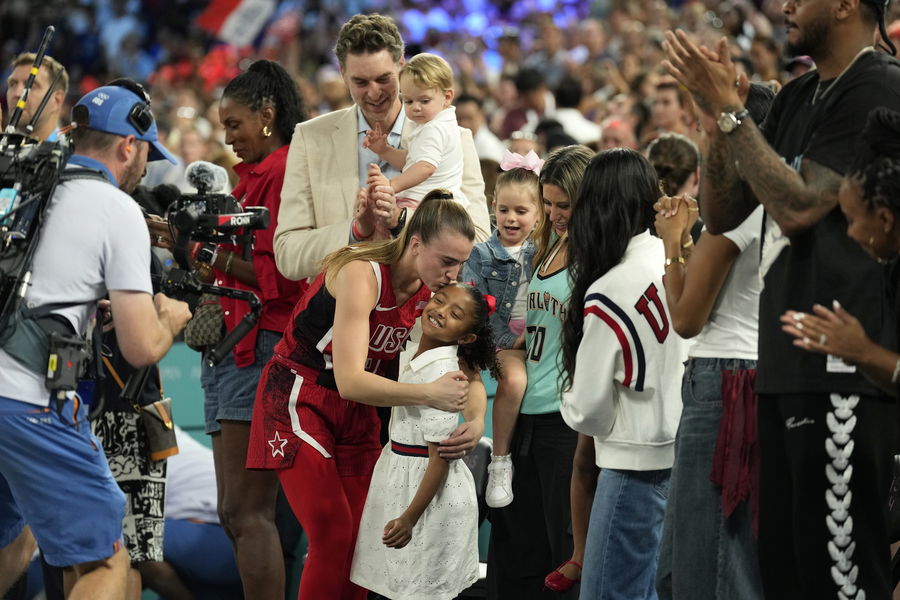 Aug 11, 2024; Paris, France; United States guard Sabrina Ionescu (6) celebrates with the family of Vanessa Bryant after defeating France in the women’s gold medal game during the Paris 2024 Olympic Summer Games at Accor Arena. Mandatory Credit: Kyle Terada-USA TODAY Sports