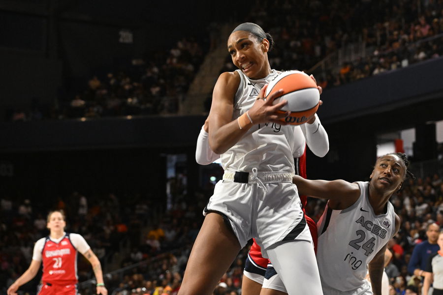 Aug 23, 2025; Washington, District of Columbia, USA; Las Vegas Aces center A’ja Wilson (22) grabs a rebound against the Washington Mystics during the third quarter at CareFirst Arena. Mandatory Credit: Rafael Suanes-Imagn Images