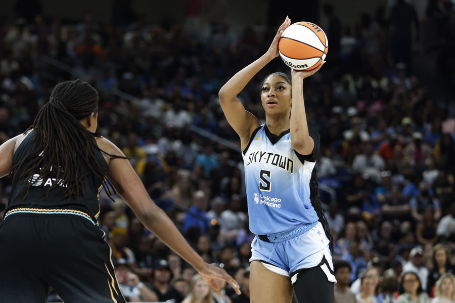 Jul 13, 2024; Chicago, Illinois, USA; Chicago Sky forward Angel Reese (5) shoots against the New York Liberty during the second half of a WNBA game at Wintrust Arena. Mandatory Credit: Kamil Krzaczynski-USA TODAY Sports