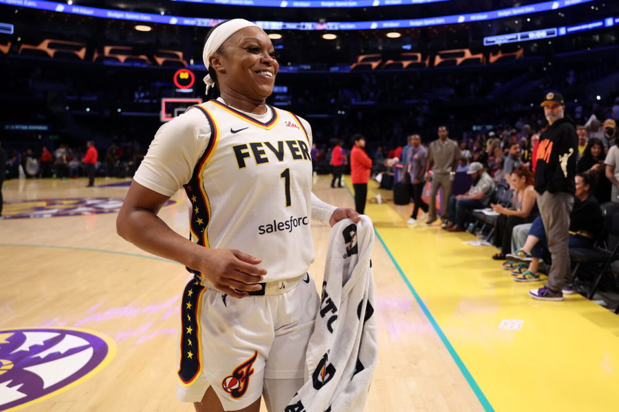 Aug 29, 2025; Los Angeles, California, USA; Indiana Fever guard Odyssey Sims (1) celebrates after defeating the Los Angeles Sparks 76-75 at Crypto.com Arena. Mandatory Credit: Kiyoshi Mio-Imagn Images