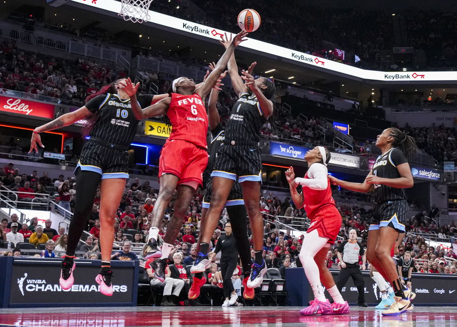 Sep 5, 2025; Indianapolis, Indiana, USA; Chicago Sky center Kamilla Cardoso (10), Indiana Fever forward Natasha Howard (6) and Chicago Sky center Elizabeth Williams (1) go for the ball during the first half at Gainbridge Fieldhouse. Mandatory Credit: Grace Smith-USA TODAY Network via Imagn Images