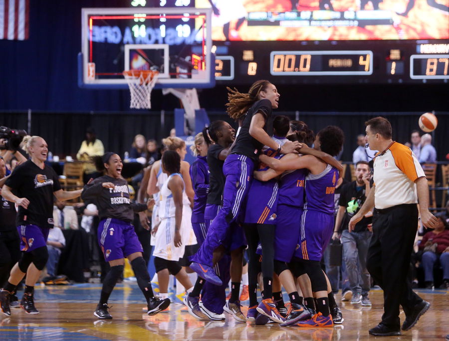 Sep 12, 2014; Chicago, IL, USA; Phoenix Mercury players celebrate after defeating the Chicago Sky 87-82 in game three of the 2014 WNBA Finals to win the WNBA championship at UIC Pavilion. Mandatory Credit: Jerry Lai-USA TODAY Sports