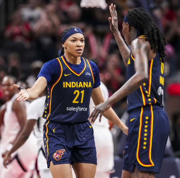 July 3, 2025; Indianapolis, Indiana, USA; Indiana Fever forwards Makayla Timpson (21) and Natasha Howard (6) high five during a game against the Las Vegas Aces at Gainbridge Fieldhouse. Mandatory Credit: Grace Smith/INDIANAPOLIS STAR-Imagn Images