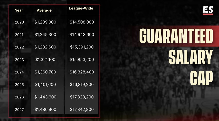 Then there’s the guarantee level, which sits about 7% below the cap. That’s the average salary the league promises its players. For 2025, that number is $1,401,600 per team, adding up to $16,819,200 across the league.