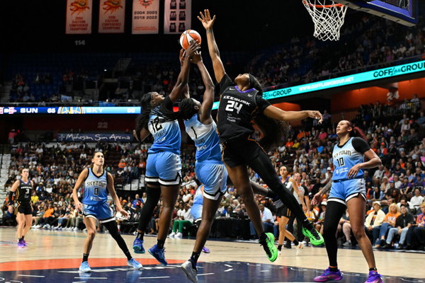 Aug 13, 2025; Uncasville, Connecticut, USA; Connecticut Sun forward Aneesah Morrow (24), Chicago Sky forward Michaela Onyenwere (12) and center Elizabeth Williams (1) battle for a rebound during the second half at Mohegan Sun Arena. Mandatory Credit: Eric Canha-Imagn Images