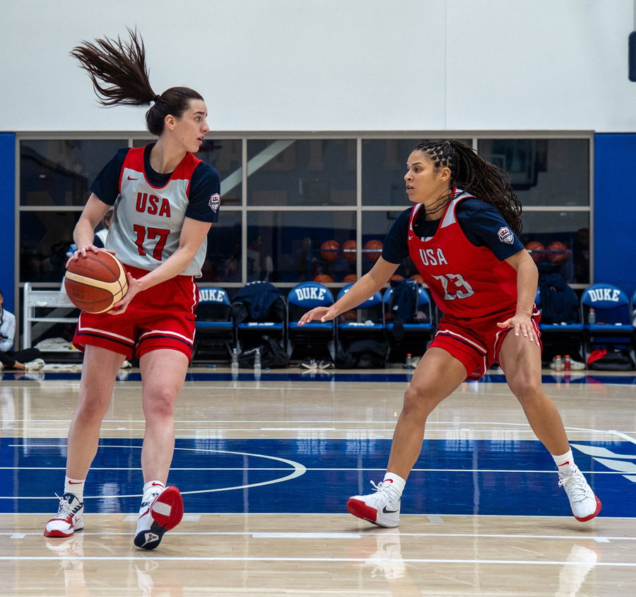 December 13, 2025, Durham, North Carolina, USA: Kelsey Plum 5 is guarded by Caitlin Clark 17 during a scrimmage at the USA Basketball Women s national team, Nationalteam December Training Camp. Durham USA – ZUMAh304 20251213_zsp_h304_005 Copyright: xAlexxHallowayx