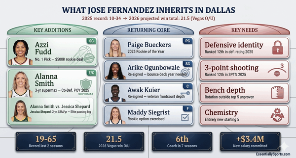 The first-year WNBA coach brings a pro-style system with Euro-based influences. His squads rely heavily on tempo, ball movement and floor spacing. Under the Fernandez system, the Wings will target 90-100 possessions per game in an effort to feed the ball to sharpshooters Bueckers and Fudd and improve a team that finished 12th out of 13 teams in three-point efficiency in 2025.