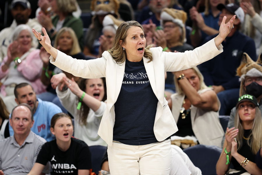 Aug 16, 2025; Minneapolis, Minnesota, USA; Minnesota Lynx head coach Cheryl Reeve reacts during the third quarter against the New York Liberty at Target Center. Mandatory Credit: Matt Krohn-Imagn Images